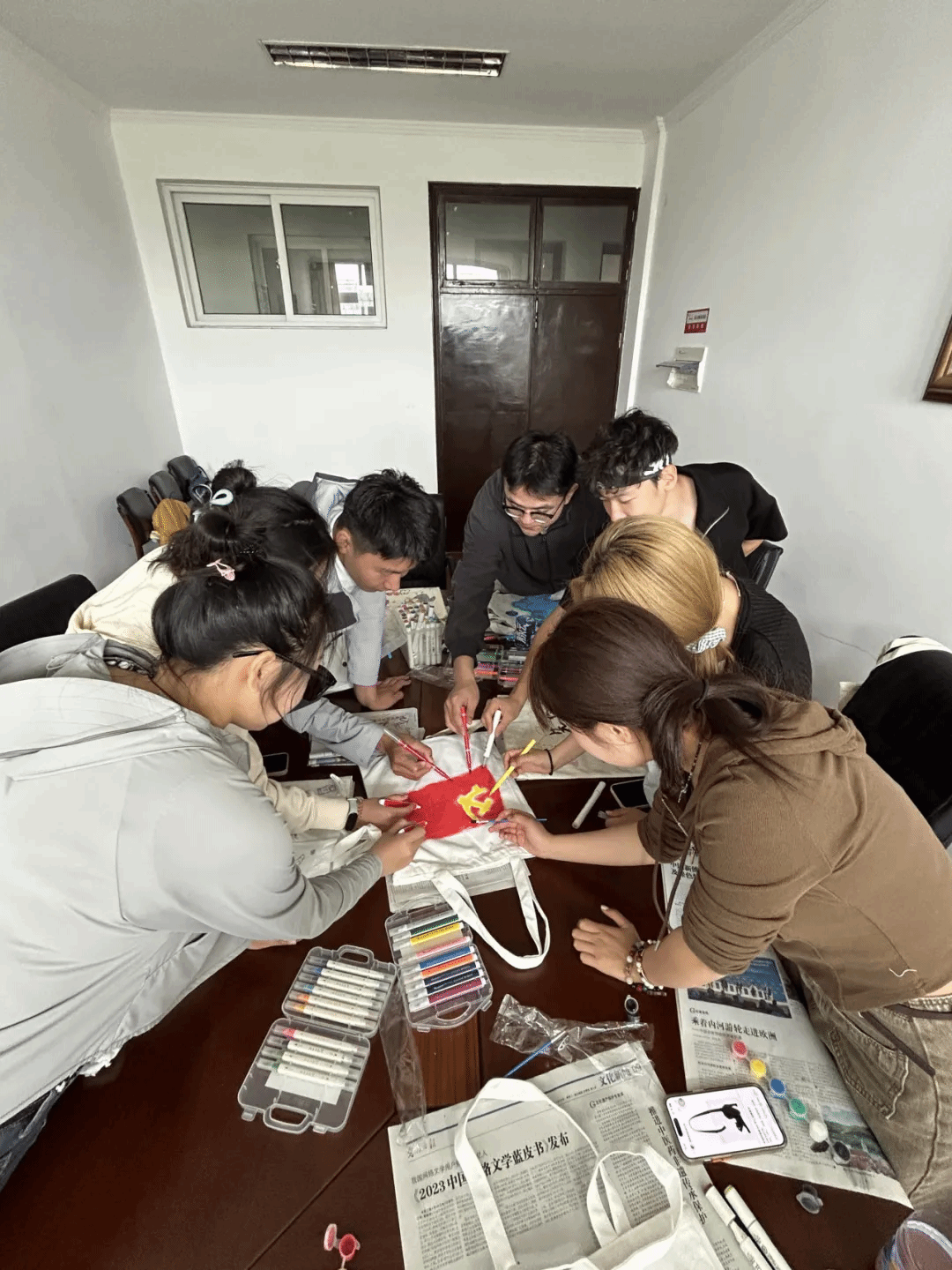 活动伊始,现场布置得非常温馨。色彩斑斓的画笔、空白的帆布袋、琳琅满目的绘画材料一应俱全,为党建的同学们提供了充足的创作空间。大家纷纷拿起画笔,开始在帆布袋上挥洒自己的艺术才华。