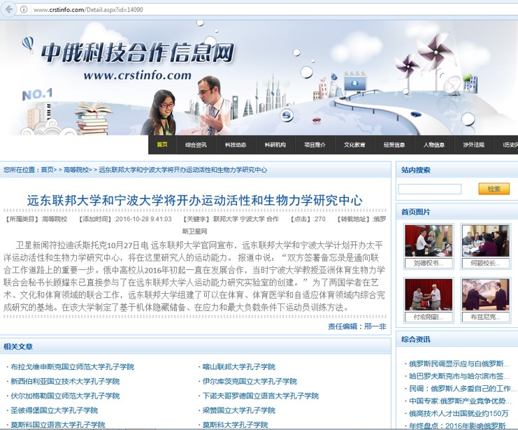与中东欧地区高校、国际组织及企业建立长效科研合作机制,主要涉及体育装备研发、体育场馆运营模式构建及承办国际学术会议等形式,以政府推动为主,民间交流合作为基础,共同开展科研项目,目前已合作发表SCI/SSCI/EI收录论文73篇,构建国际间科研创新平台“俄罗斯远东联邦大学—偷拍