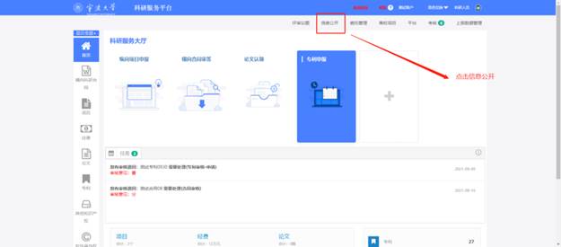1.项目由管理员下发,进入待公开列表。科研人员登陆科研服务管理平台,点击右上角信息公开按钮,进入信息公开界面。