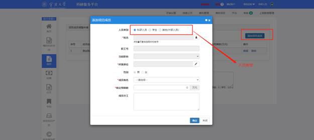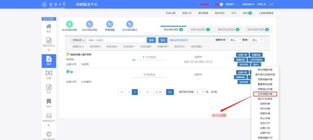 4. 进入项目组成员,请确认成员是否完整。特别是项目中有学生的参与的,请完善学生身份类别。成员信息有问题的,进入科研系统偷拍,左侧的项目界面,点击操作下拉框下的成员调整申请,进入成员调整界面进行添加和修改,待项目主管审核之后,会自动补充到项目经费公开一览表,最后再提交即可。
