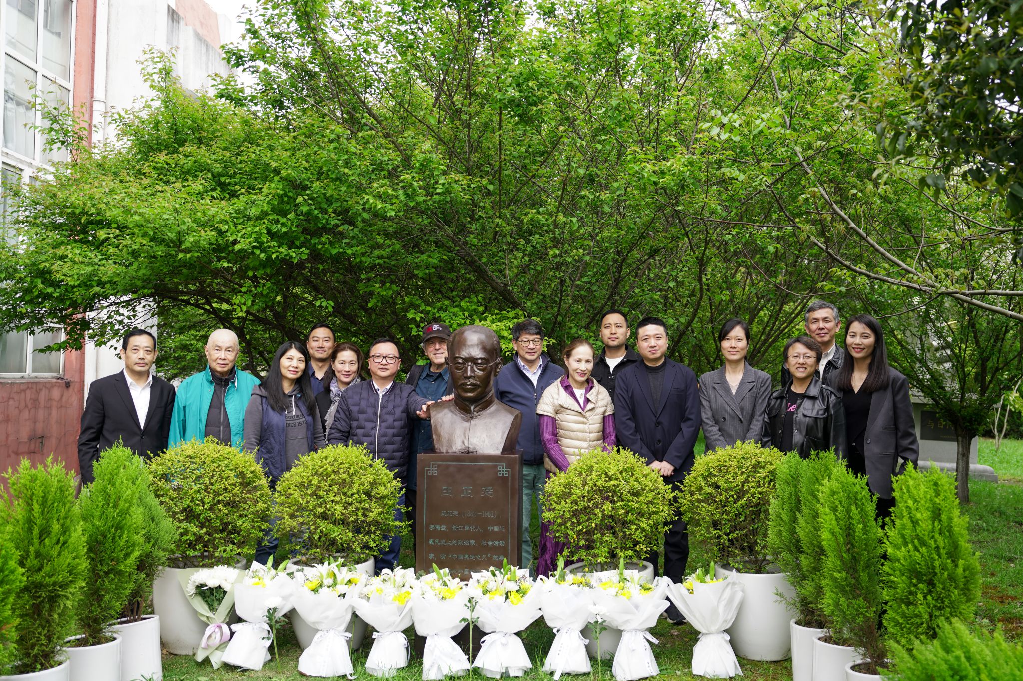 东侧草坪举行了清明祭扫仪式,并向王正廷雕塑敬献菊花缅怀,最后合影留念。随后,徐女士携同亲友一起参观了偷拍