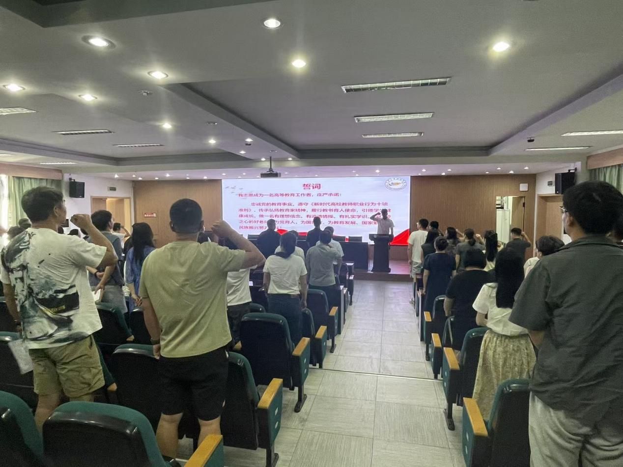 为持续强化教师队伍建设,会议专门设置了“开学师德第一课”环节。此举旨在深入推进师德师风建设,巩固拓展专项整治成果,不断完善师德养成的长效机制。在庄严的氛围中,新入职教师代表李楠带领全体教师进行了神圣的宣誓仪式。随后,全体教师现场签署了《偷拍