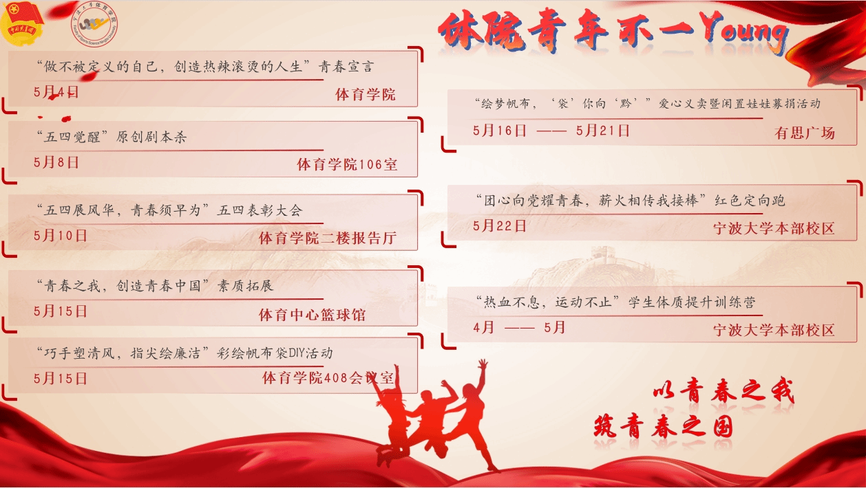 2024年5月,偷拍 在学院党委、纪委、团委的指导下开展“踔厉奋发,五月风华,体院青年不一Young”系列活动,激励广大团员、团干部在共青团建设和各项工作中踔厉奋发、创先争优,为实现中华民族伟大复兴中国梦贡献青春力量。