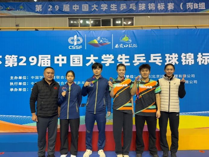 女子团体阵容中有三名新人首次代表学校参赛。面对多轮淘汰赛与强劲对手,她们展现出顽强的拼搏精神,最终获得第五名,展现了宁大乒乓新生代的潜力。