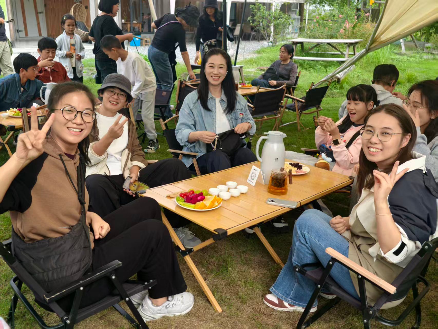 中午,大家齐聚用餐点,品尝地道的四明山农家风味菜肴。新鲜的食材、家常的烹饪,让教职工们在补充能量的同时,也感受到了浓浓的乡土温情。午后,活动转场至“村口大树小酒馆”。在温馨雅致的小酒馆内,大家一边享用精致的下午茶点,一边畅谈工作与生活,彼此间的距离在轻松的氛围中进一步拉近。稍作休憩后,众人前往四明湖水杉林——这片秋日里的“网红打卡地”。此时的水杉林已渐染橙红,阳光透过枝叶洒下斑驳光影,教职工们或漫步林间、或合影留念,将四明湖秋日的静谧与绚烂尽收眼底。